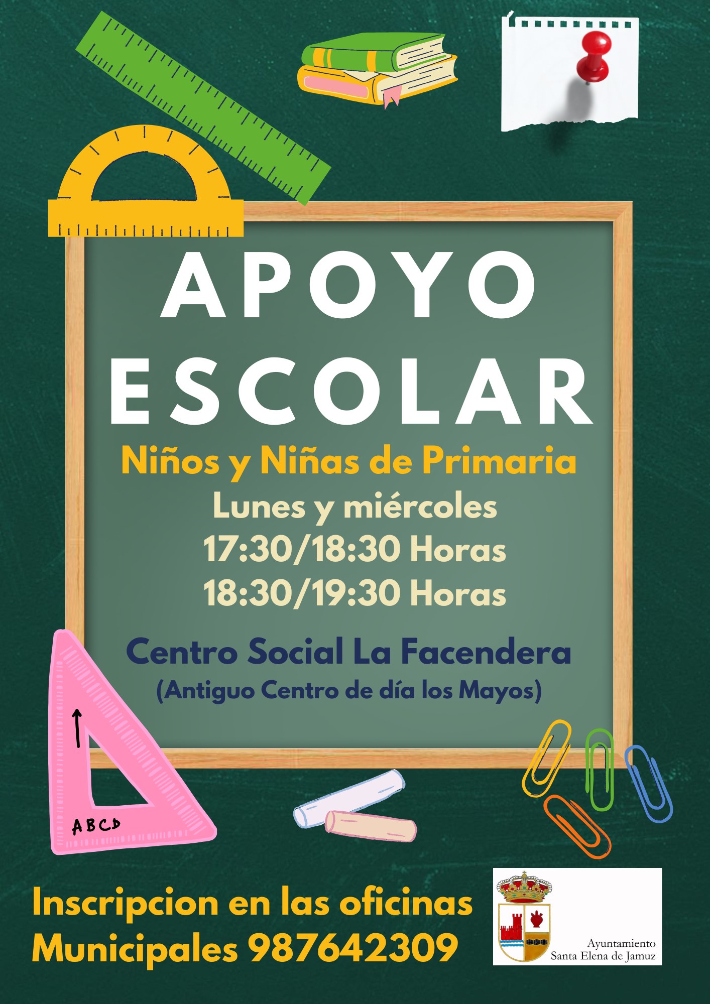 Se expone, para conocimiento de la población, que el Ayuntamiento de Santa Elena de Jamuz tiene previsto la realización de la actividad APOYO ESCOLAR, para niños/as de educación primaria. La actividad se iniciaría el 13 de octubre hasta finales de marzo 2026, y es gratuita. El horario será de 17,30 a 19,30 los lunes y miércoles. Los padres/madres de familia que deseen inscribir a sus hijos pueden hacerlo en las oficinas municipales del Ayuntamiento o bien remitiendo la documentación al siguiente correo electrónico: registro@aytosantaelenadejamuz.com