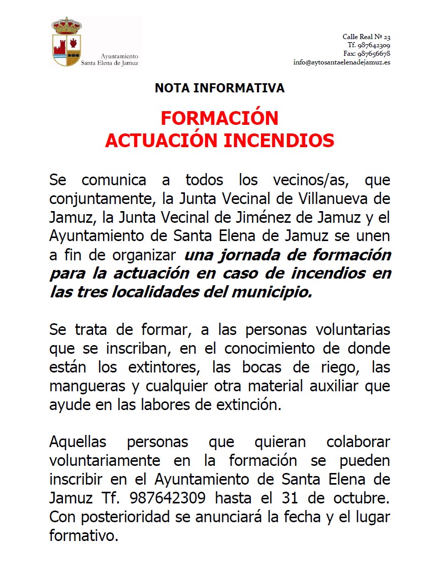 Se pone en conocimiento de la población la presente nota informativa sobre la formación básica en actuación sobre incendios que se pretende organizar en nuestro municipio