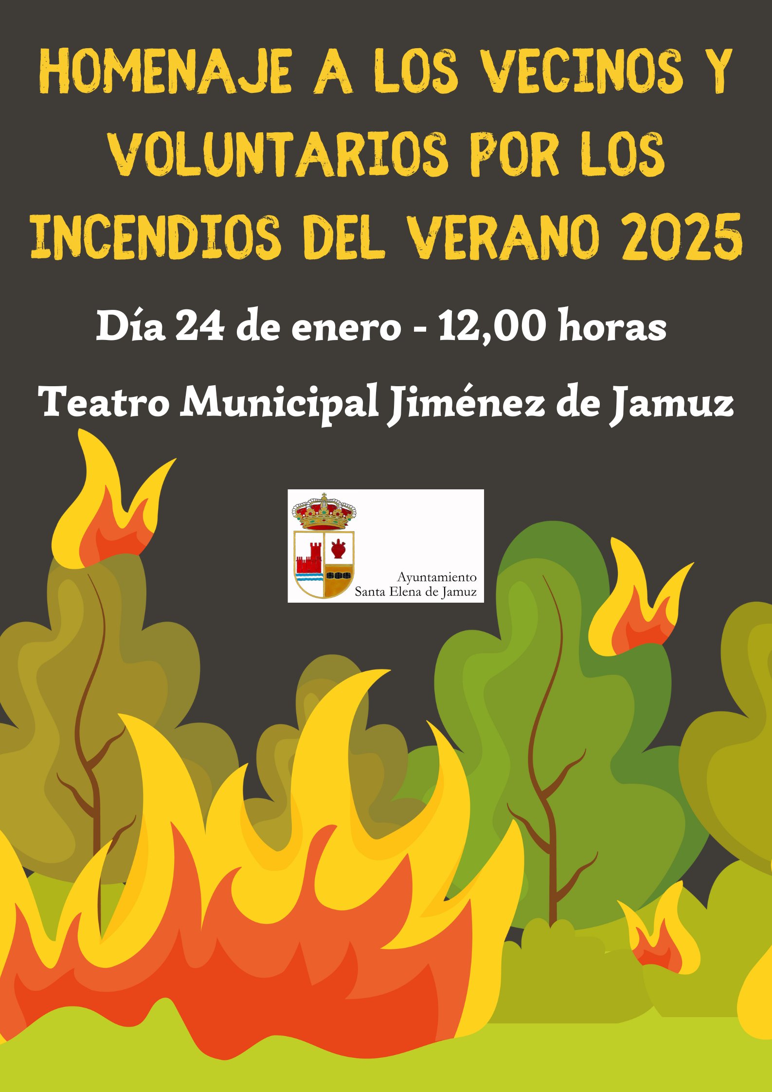 1. Como motivo de los incendios forestales del verano de 2025, el Ayuntamiento de Santa Elena de Jamuz tiene previsto realizar un homenaje a los vecinos y voluntarios que participaron en las labores de extinción. El acto se celebrará el sábado 24 de enero, a las 12,00 horas en el teatro de Jiménez de Jamuz, abierto a todo el público que quiera asistir.  En próximas fechas se dará a conocer la relación de actos.