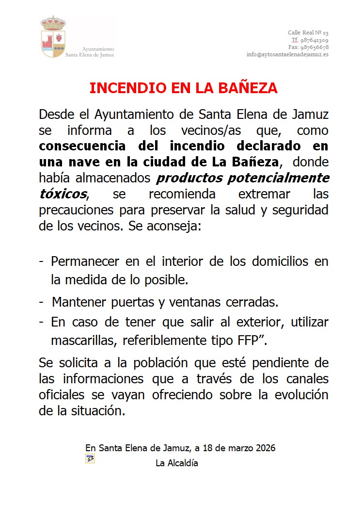 Se expone, para conocimiento de la población, las recomendaciones a seguir tras el incendio en la nave situada en La Bañeza