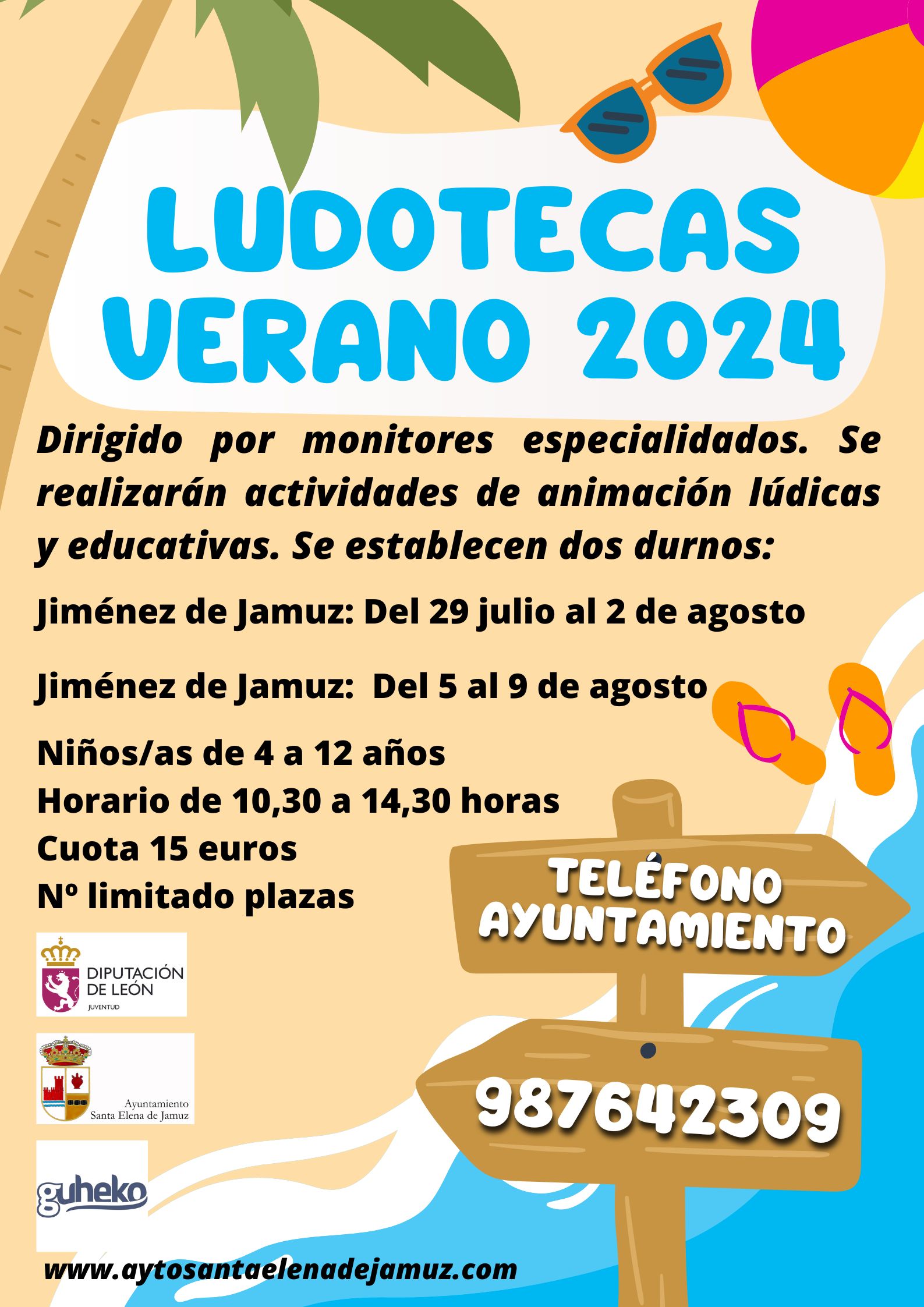 Se expone, para general conocimiento de la población, que durante este verano se organizan dos LUDOTECAS para los niños/as con edades comprendidas entre los 4 y los 12 años. Las ludotecas se realizarán en la casa de cultura de Jiménez de Jamuz. En el cartel expuesto a continuación se detallan fechas, horarios y cuota de participación. Esta actividad se realiza al amparo de la convocatoria de subvenciones de la Diputación Provincial de León para financiar programas municipales en materia de juventud para el año 2024.