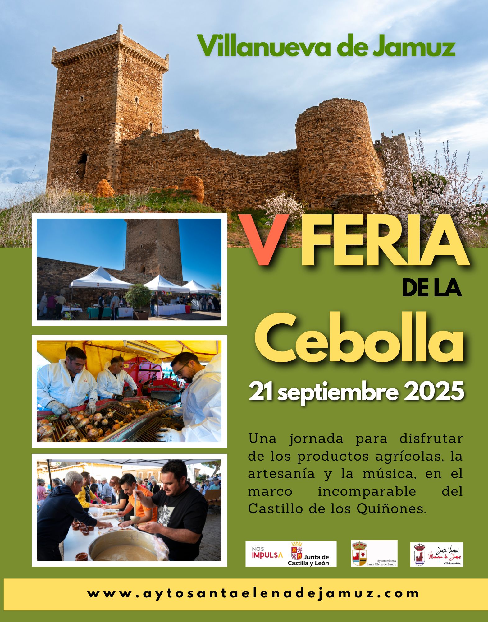 Se pone en conocimiento de la población que el domingo 21 de septiembre, en la localidad de Villanueva de Jamuz, se celebrará la V Feria de la Cebolla. En próximas fechas se expondrá el programa de actos. Los artesanos/as interesados en participar en la feria pueden inscribirse llamando al teléfono del Ayuntamiento de Santa Elena de Jamuz 987642309